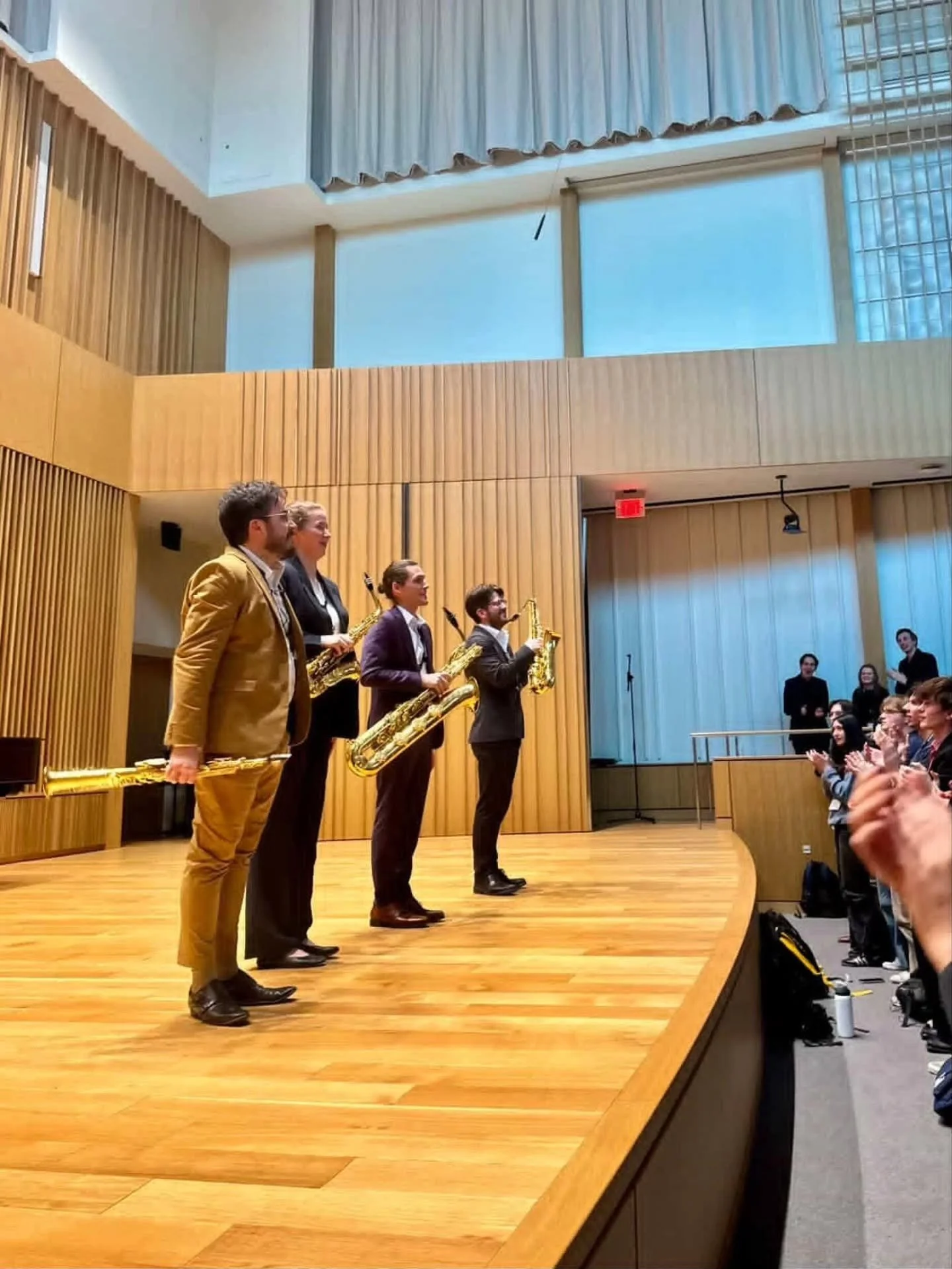 Founded in 2016, the Chicago-based ensemble is dedicated to championing new music for saxophone and building community through innovative, inclusive, and exceptional musical experiences. With more than 120 world premieres to date, the members of ~Nois have had the privilege of working closely with some of the worldβs leading voices in composition to create new works for saxophone quartet, including Viet Cuong, Alex Mincek, Jessie Montgomery, Nico Muhly, Shawn Okpebholo, Jeff Scott, Hans Thomalla, Augusta Read Thomas, Darian Donovan Thomas, and Kari Watson. The ensemble has also been awarded top prizes at numerous prestigious chamber music competitions including the M-Prize International Arts Competition, the Fischoff National Chamber Music Competition, and was once deemed, βToo loud for the Farmersβ Marketβ (Evanston Local, Illinois 1st Ward Constituent). Read more here.